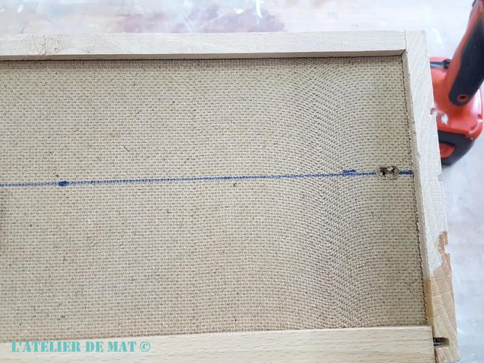 Afin d’être plus à l’aise pour effectuer les quelques modifications à apporter à cette boîte à pain pour devenir une boîte à téléphones ;), j’ai décidé de commencer par enlever le fond. Rien de bien compliqué car c’est le style de fond très fin (3mm) que l’on voit sur beaucoup de meubles du commerce. J’ai tracé une ligne pour identifier le milieu et j’ai percé un trou sur un des côtés.