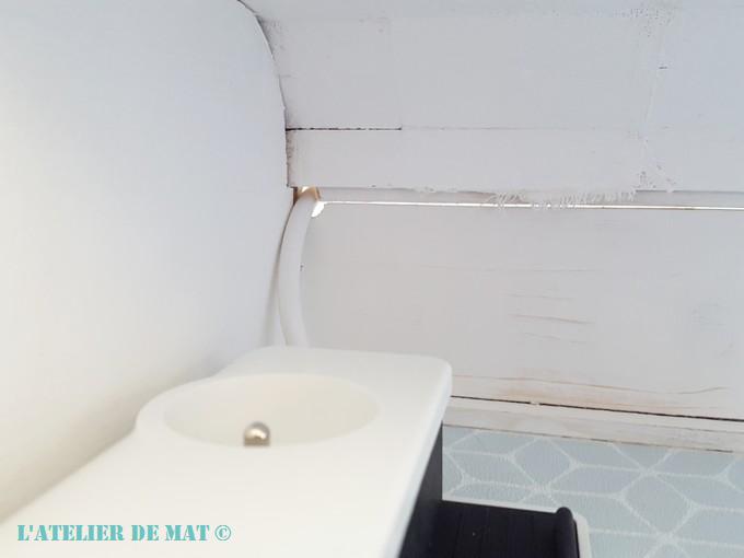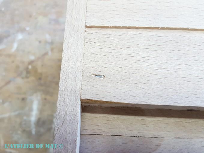 J’ai choisi de ne pas fixer le fond de la boite afin de pouvoir remplacer si besoin le chargeur ou le prendre pour partir en vacances. J’ai utilisé deux planches fines de lambris que j’ai peintes et qui sont maintenues par un peu de colle chaude. J’ai juste fait un petit trou pour passer la prise du chargeur.