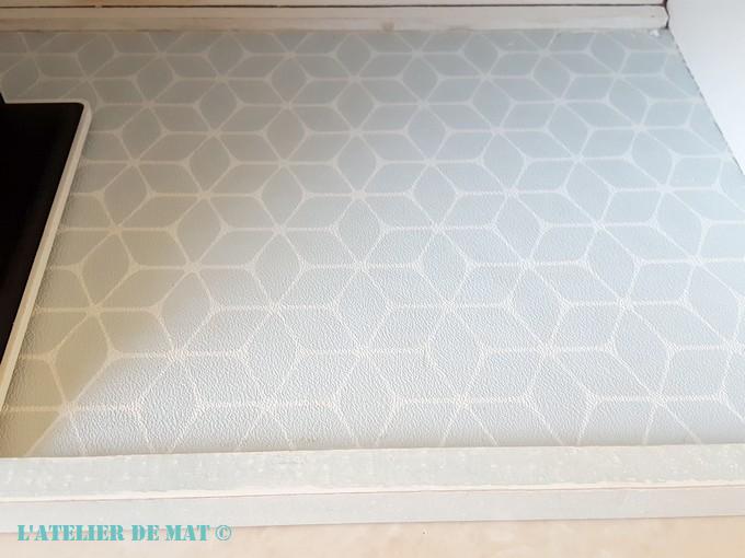 Le fond de la boite étant de la même matière bas de gamme que le fond d’origine, j’ai collé cette belle chute de papier peint à l’aide de Mod Podge. Les couleurs s’accordent parfaitement avec celles de la boite.