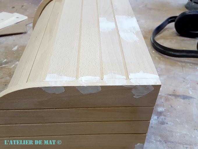 Maintenant que les modifications sont faites il est temps de préparer la boite pour pouvoir la peindre et il y a du boulot. Cette boite à pain à beau être neuve, elle est pleine de défauts. Pour commencer un clou ressort sur le dessus; sympa non? ;).