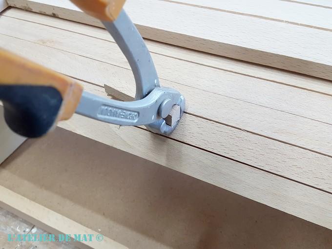 La poignée d’origine n’étant pas vraiment sexy et en plus étant fixée de travers à l’aide de clous , j’ai enlevée celle ci avec une paire de tenailles.