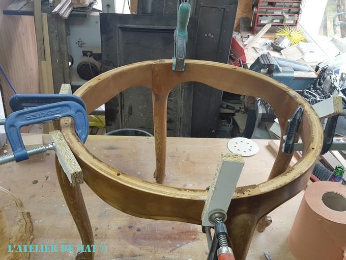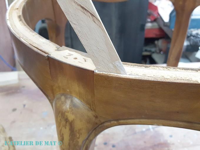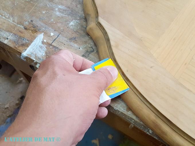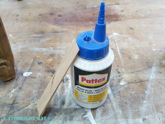 J’ai donc sorti ma petite bouteille de colle à bois et en faisant un tour dans la poubelle à chutes de l’atelier, j’ai trouvé la petite spatule dont j’allais avoir besoin.
