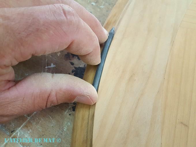 Il me restait encore le bord du plateau à faire et impossible d’utiliser une machine ici. Alors pas d’autres choix que de faire un ponçage manuel. Pour m’epargner un peu dans cette tâche, j’utilise des petites astuces. Par exemple pour poncer la petite « rainure » j’utilise une carte de fidélité que j’enroule dans le papier à poncer. Ainsi cela permet d’atteindre des endroits vraiment trop fins pour avoir un bon résultat juste avec les doigts. De plus cela ne déforme pas le « profilé » de la forme.