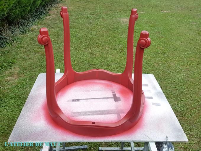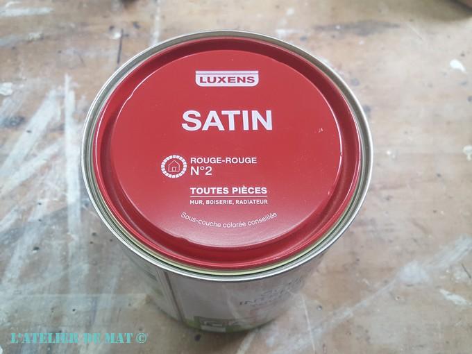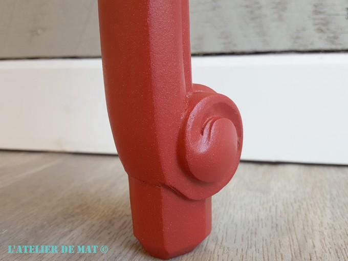 J’ai poncé aussi tout le pied de la table basse à la main mais assez parlé de ponçage, c’est pas très marrant ! ;). Si vous suivez ma page Facebook, vous avez dû voir qu’il y a quelques semaines de cela, le Leroy Merlin près de chez moi changeait sa collection de peinture et qu’il y avait des promos. À 3.5€ le pot au lieu de 12€, c’était une invitation à l’audace, alors pourquoi pas se laisser tenter par ce rouge ?
