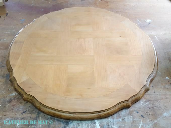 Le dessous du plateau lui m’a donné un peu plus de mal. J’ai attaqué en grain 120 mais comme cela n’avançait pas et que mon disque s’encrassait, je suis descendu en grain 80. Quand tout a été poncé, je suis repassé à un grain 120. Il est important que toutes les surfaces qui seront teintées soient poncées avec le même grain afin d’éviter des variations de couleur dans la teinte par la suite.