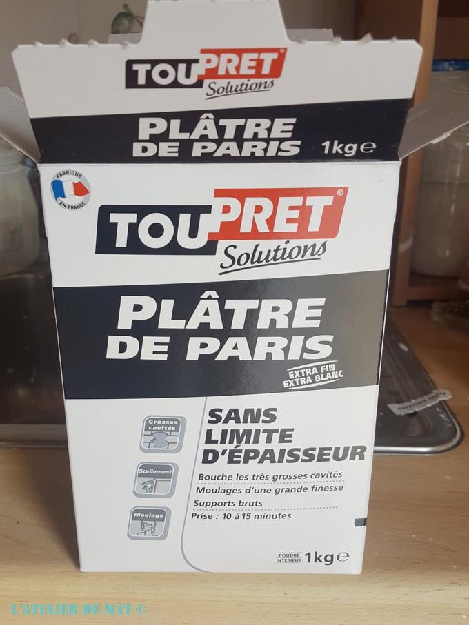 Une fois de plus je vais ajouter du plâtre dans ma peinture. Pas besoin de plâtre hors de prix pour cela, un plâtre premier prix comme ici à 3.8€ suffit largement. Le plâtre permet une meilleure accroche de la peinture, l’opacifie ce qui est toujours très bien et permet un rendu que j’adore. Voici ma recette:
