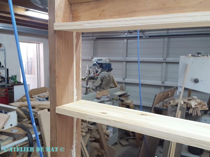 Puis ensuite j’ai pu débiter mes étagères avec ma scie sur table et faire les ajustements nécessaires. Les montants de chaque coté n’étant pas parfaitement parallèle l’un à l’autre, chaque étagère a nécessité un ajustement spécifique.