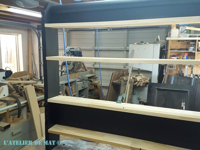 De retour à l’atelier, le résultat n’est pas trop mal pour le moment mais il me restait encore à teinter les étagères. J’ai une nouvelle fois vérifié que celles ci s’integraient bien et qu’il n’y avait pas de souci d’ajustement dû à l’épaisseur ajoutée par la peinture.