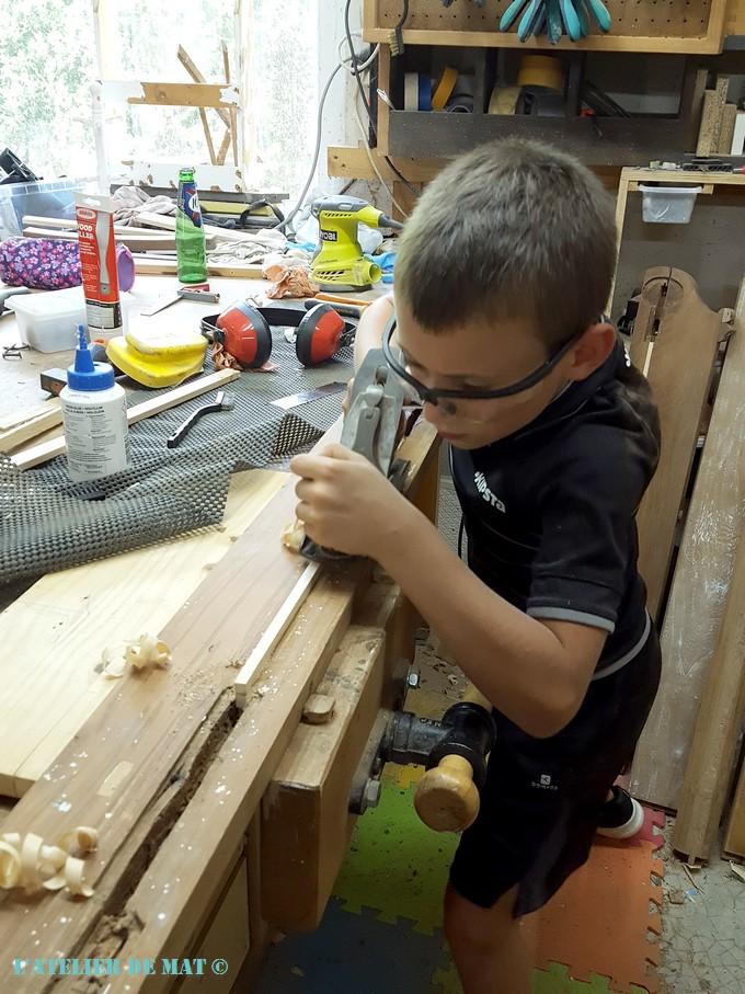 Pour ramener la baguette à la bonne hauteur par la suite, rien de mieux que mon vieux rabot Stanley. J’ai fait le premier pied et alors que j’allais commencer le deuxième, mon plus grand fils Antoine passait par là. Voila une occasion toute parfaite pour lui apprendre le maniement du rabot. Et il s’en est très bien sorti après quelques conseils même s’il a trouvé ça un peu dur ;).