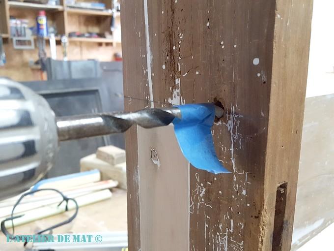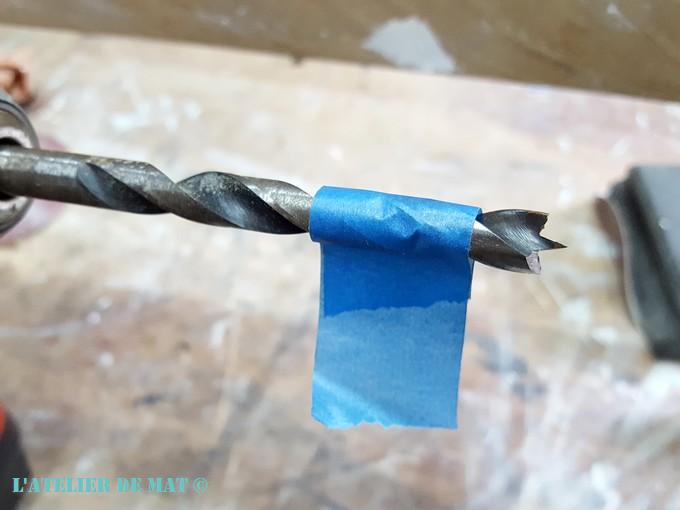 Afin que les vis de fixation ne soient pas visibles, car il faut le dire une vis c’est pas très beau, j’ai percé les cotés des pieds afin « d’enfouir » la tête de vis. Le petit truc est qu’il ne faut pas trop percer afin que la vis ait quand même de quoi tenir. La petite astuce consiste donc à faire une « jauge de profondeur » à l’aide d’un morceau de scotch.