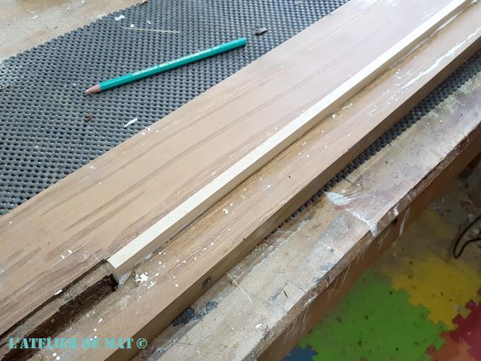 Ici j’avais une pièce de sapin qui traînait dans mon bac à chutes. Un léger ponçage et une petite coupe pour la mettre à la bonne longueur ont suffit pour qu’elle soit parfaite pour boucher la rainure. Ensuite je n’ai eu qu’à mettre un peu de colle et attendre que cela sèche.