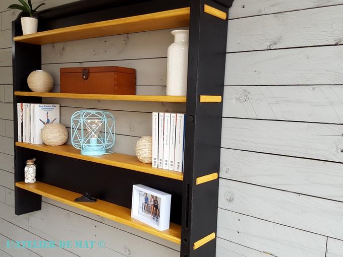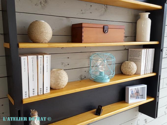 Le déroulement de ton travail est passionnant, bourré d’astuces. Le rendu final est super. A mon goût j’aurais mis une étagère en bas. Le contraste de la peinture noire et des étagères est parfait. BRAVO