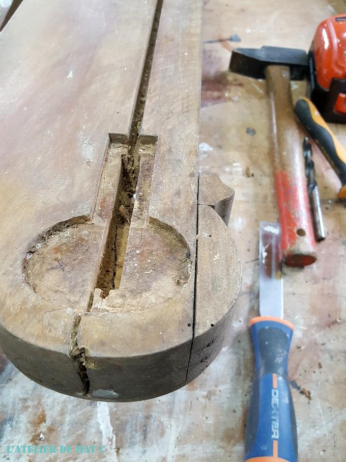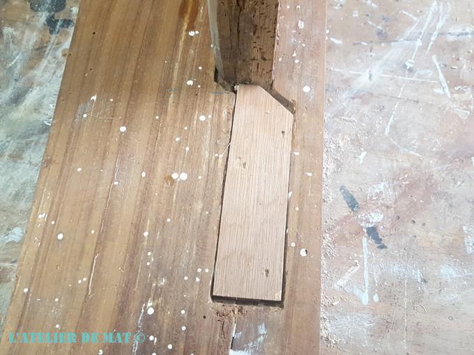 Le dernier gros chantier qu’il me restait à traiter était la réparation d’un des montants. Le bois était vraiment très fin à cet endroit et il était trop abîmé pour être conservé. La seule solution à mon avis était un insert.