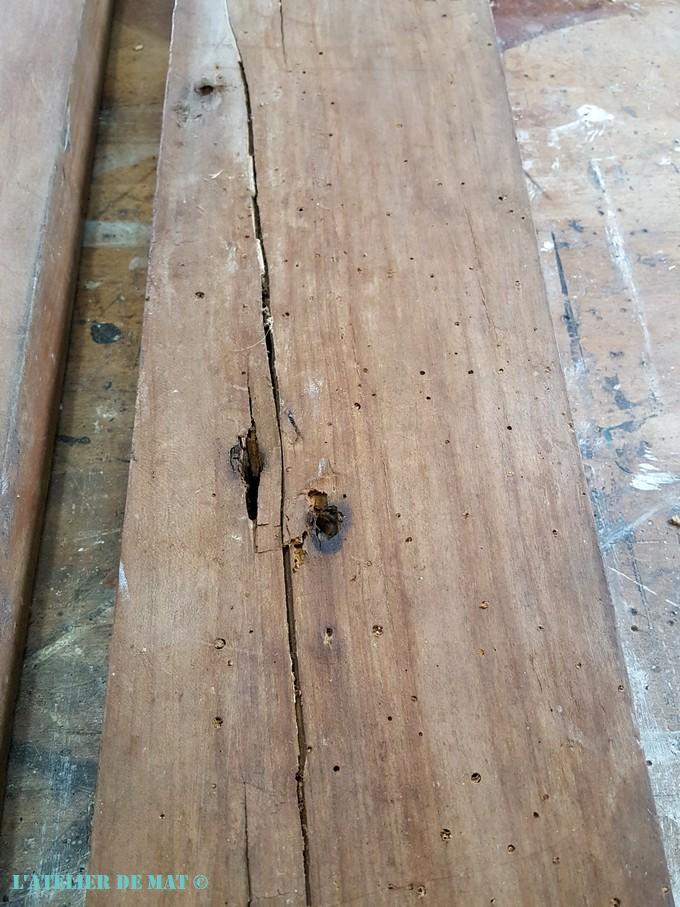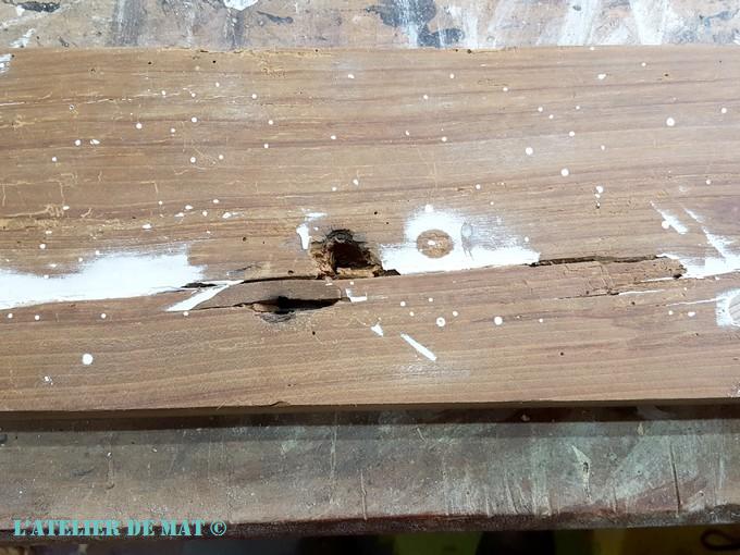 En plus des trous laissés par les clous et de la grande fente, j’ai dû aussi reboucher beaucoup, en tout cas plus que je ne l’aurai souhaité, de trous dus à la présence passée d’insectes xylophages. Ça en fait du mastic non? Pas d’inquiétude après ponçage cela fera moins peur ;).