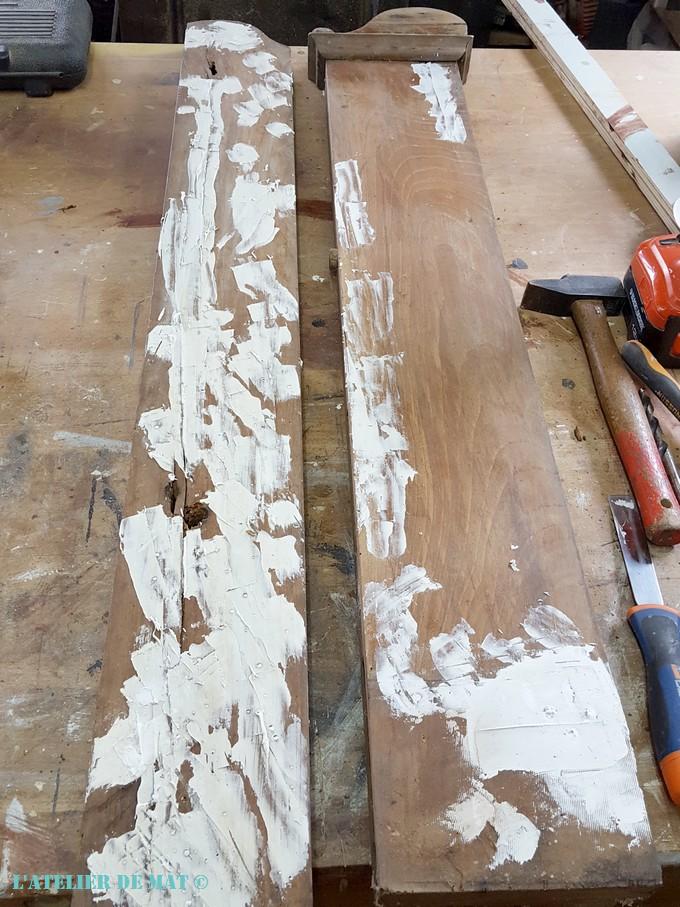 Outre le rouleau, il me restait encore ces deux pièces à préparer. La planche fine est celle qui s’insère juste sous le rouleau et la plus grande est celle qui se trouve en bas de la tête du lit. Bien entendu elles sont pleines de trous de vers donc un bon masticage a aussi été nécessaire.