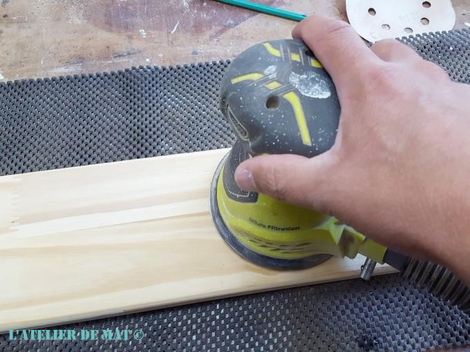 Tout étant ok, à l’aide ma ponceuse excentrique j’ai attaqué le ponçage. Un petit truc que j’ai appris lors de la réalisation de mon établi il y a 6 ou 7 ans et où j’avais connu un souci de couleur, c’est que le rendu donné pour une couleur de teinte est obtenu sur un bois poncé en grain 120 (outre l’essence du bois bien entendu) . Alors depuis je ponce toujours en grain 120 pour être sur que la teinte rende comme je l’espère.