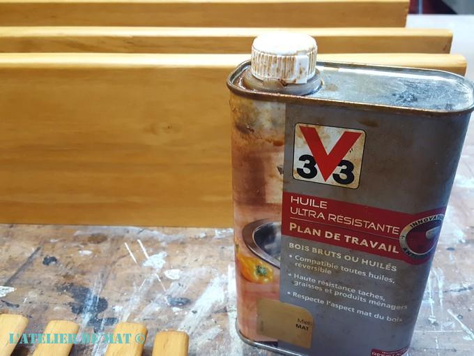 Afin que les étagères tranchent bien avec le noir de la structure du lit, j’ai choisi la finition « Miel mat » de chez V33. J’utilise des mèches de coton pour l’application.