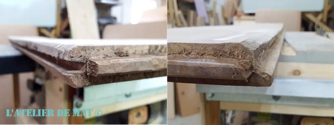 A l’aide de ma défonceuse munie d’une fraise droite, j’ai crée une cavité plus grande que la zone abîmée et d’environ 1 cm de profondeur. J’ai ensuite inséré un morceau de bois de la bonne épaisseur dans celle ci que j’ai collé, mastiqué puis poncé.