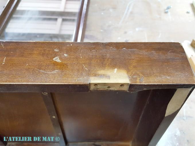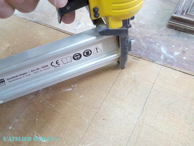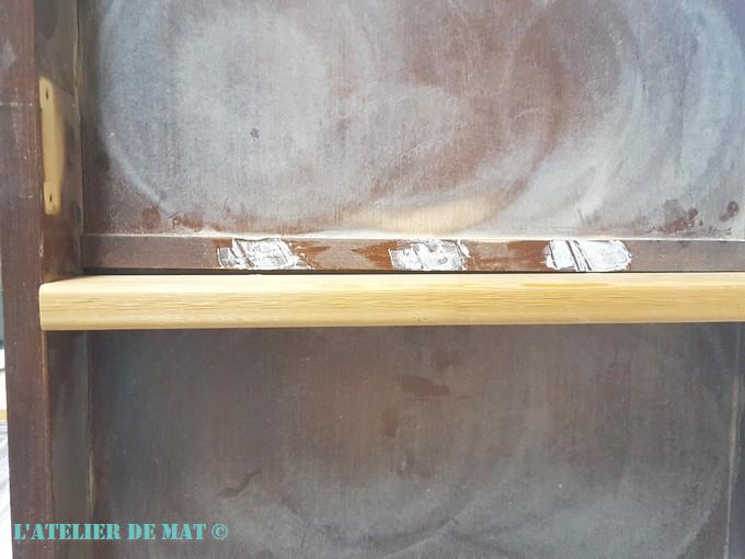 Le fond étant un peu détaché par endroit, je me suis servi des étagères pour le fixer de façon plus correcte. Pour être sûr de ne pas clouer « dans le vide » j’ai tracé une ligne correspondante au milieu de mon étagère environ. Simple et efficace. Ce n’est pas un truc que j’ai inventé car si on regarde la boite, les deux taquets d’origine ont aussi été fixés de cette façon.