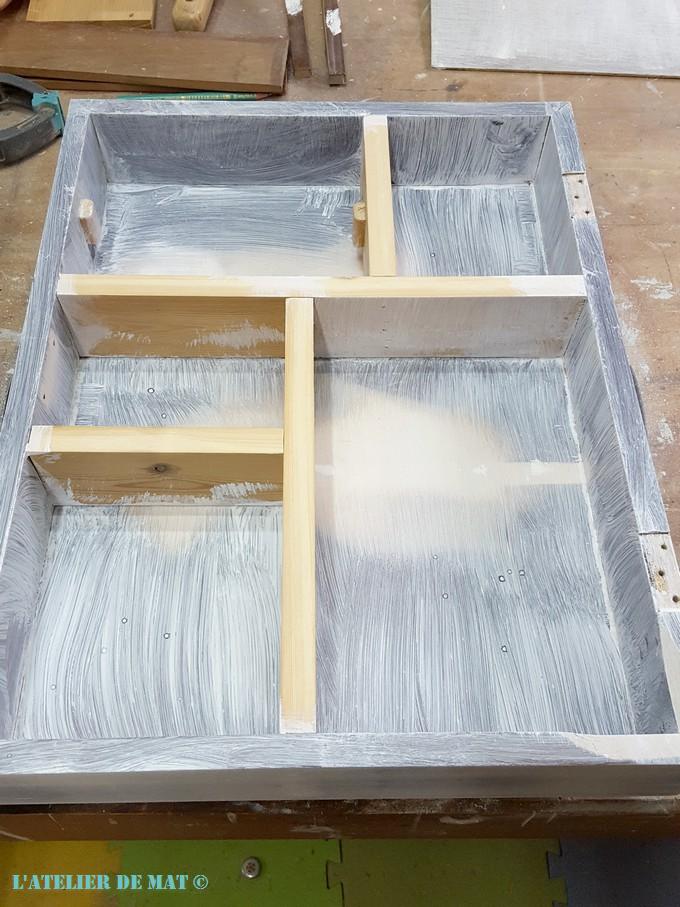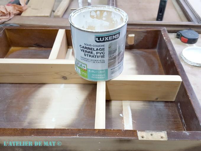 Vous remarquerez que je n’ai mis de l’apprêt que sur les parties d’origine du cadre car les étagères ajoutées étant en bois brut, elles ne présenteront pas de difficultés lors de la phase de peinture.