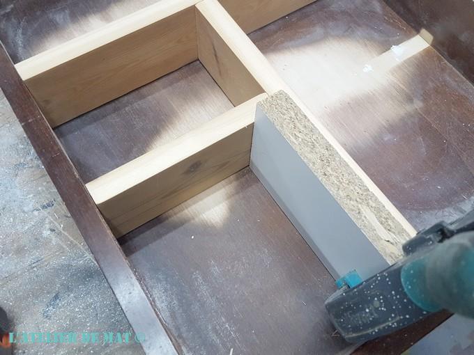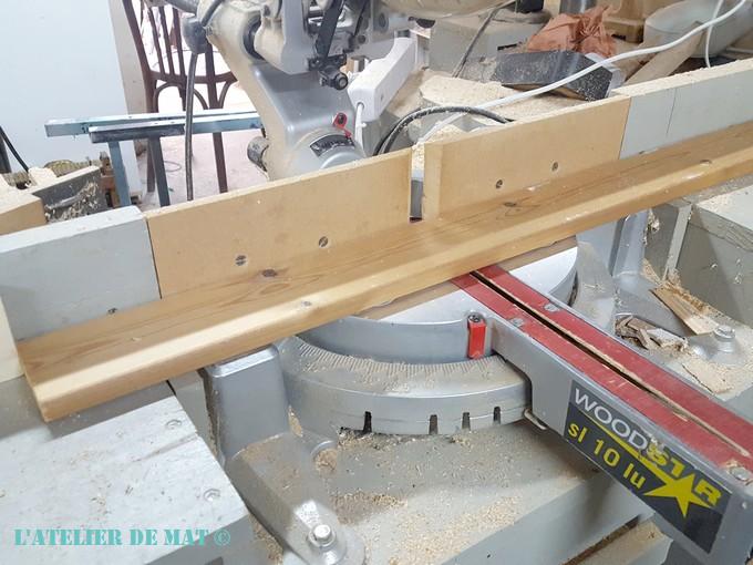 Avec ce premier travail réalisé, j’ai pu continuer avec l’étape suivante: construire l’intérieur. Qui dit cadre à bijoux, dit donc étagères, tiroirs, crochets pour tout ranger. J’ai cherché ce que j’avais de plus cohérent à l’atelier pour construire les séparations et je suis tombé sur cette latte de sommier qui me restait de mon projet de lit transformé en banc. Et ma scie à onglets s’est montré l’outil parfait pour faire mes découpes.