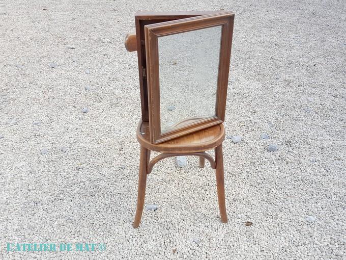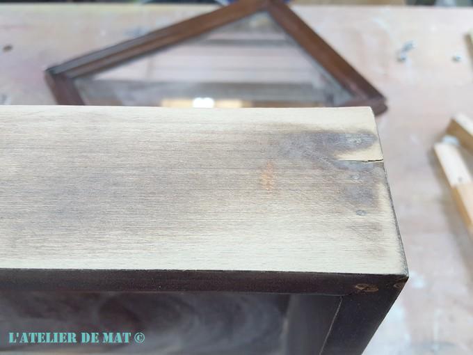 J’ai par la suite assemblé les tiroirs, rien d’extraordinaire juste de la colle et des serres joints, et pendant que cela séchait tranquillement j’ai préparé le reste du cadre à bijoux pour la peinture. En bon élève, j’ai suivi mes propres conseils pour repeindre un miroir et j’ai donc démonté celui ci. Il m’a juste suffi pour cela d’enlever les quelques agrafes retenant la plaque le maintenant.