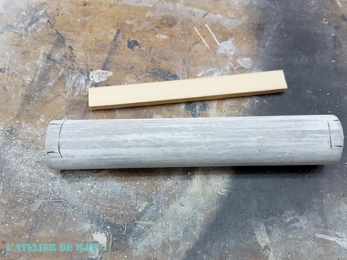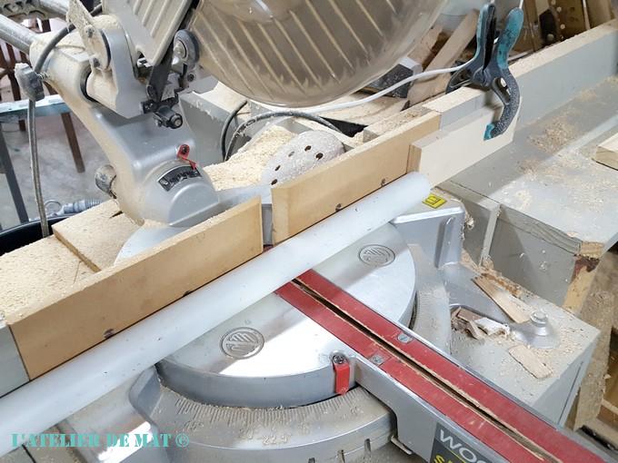 Une petite fonctionnalité que je voulais intégrer dans ce cadre à bijoux est la possibilité de ranger des montres ou des bracelets. J’ai regardé ce qu’il se faisait dans le commerce et j’en suis arrivé à la conclusion qu’un tube en PVC ferait très bien l’affaire. Pour être sur de le couper bien droit j’ai encore utilisé la scie a onglet plutôt qu’une scie à métaux manuelle.