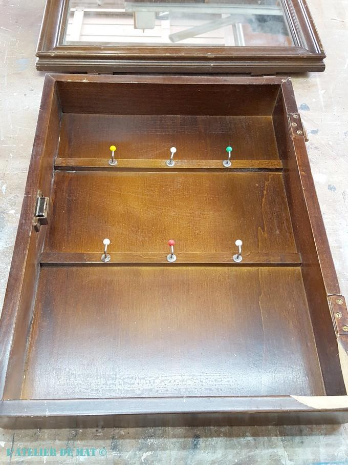 Alors oui c’est bien une boite a clé comme le prouve l’intérieur de celle ci, mais ce n’est pas cet usage que je lui réserve pour plus tard. Je trouve qu’elle a toutes les caractéristiques nécessaires pour en faire un cadre à bijoux. Le miroir déjà présent aura vraiment son utilité comme cela.