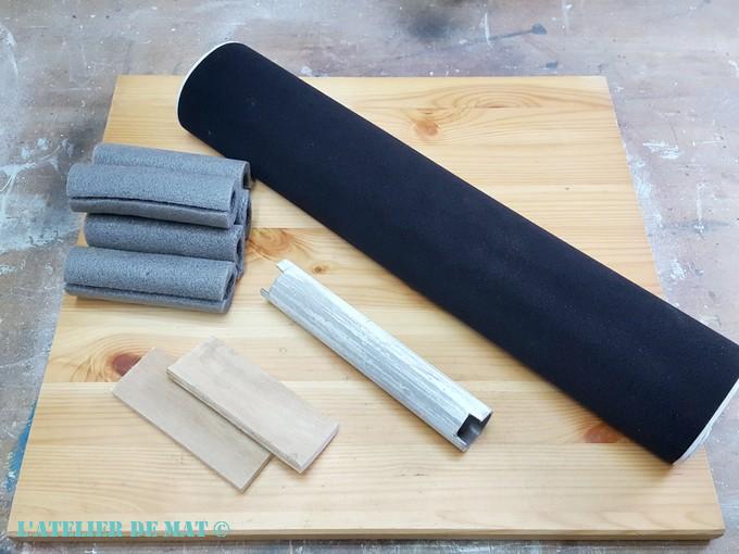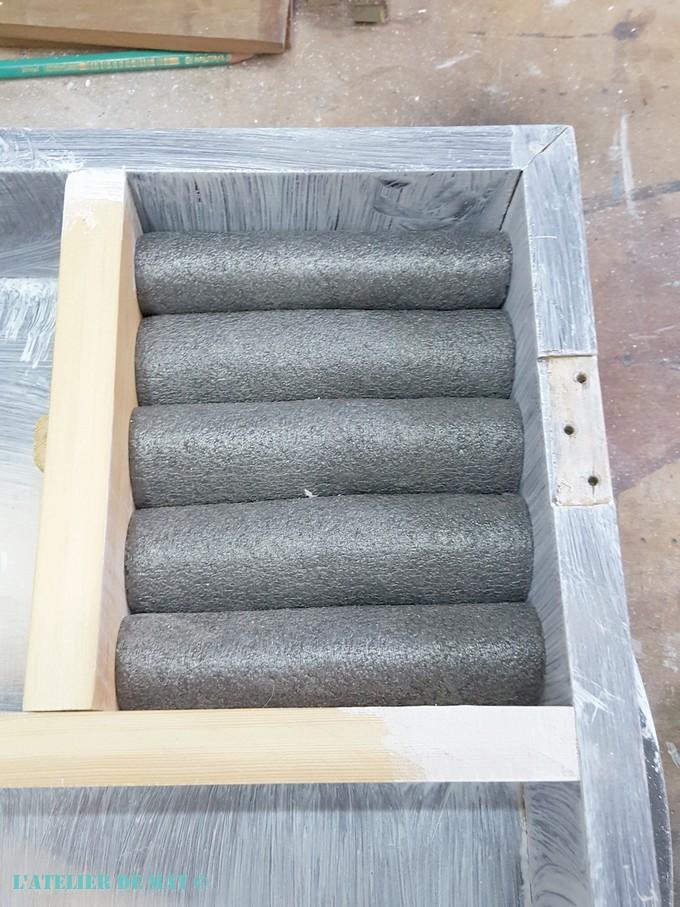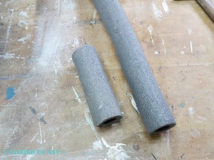 Autre petite fonctionnalité à inclure dans ce cadre à bijoux: un système pour accrocher les bagues et/ou les boucles d’oreilles. Pour cela je vais utiliser de l’isolant pour tuyau de chauffage mais d’une façon différente que pour cette vitrine.