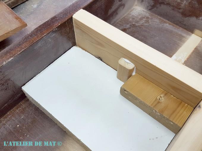 Dès que je peux éviter de prendre des mesures, je le fais. Fainéant ou malin, à vous de voir 😉 Ici où j’ai utilisé la cale blanche comme référence pour la hauteur et la petite cale marron pour la hauteur. Je n’ai donc eu qu’à encoller l’un des taquets de fixation et le mettre en place (j’ai enlevé le serre joint qui le maintenait en place le temps du collage pour la photo ;)).