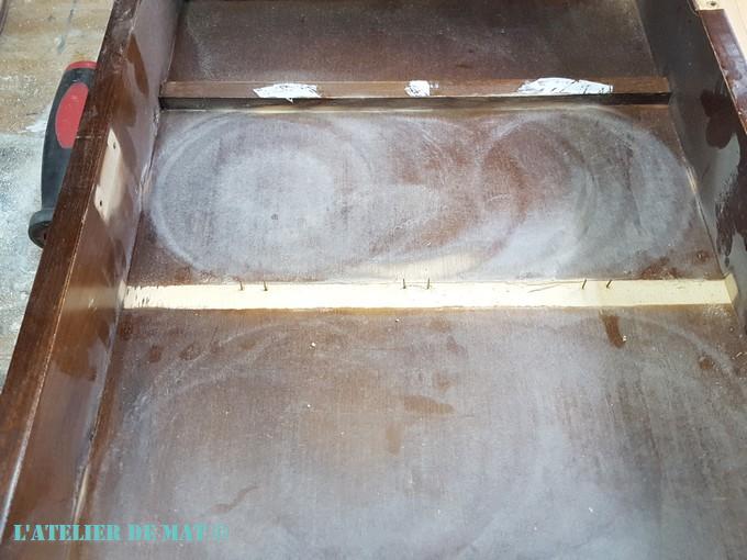 Vous le savez , je ne suis pas fan de ponçage mais quand c’est un gain de temps comme ici, où cela enlèvera le vieux vernis et les tâches diverses, je n’hésite jamais.