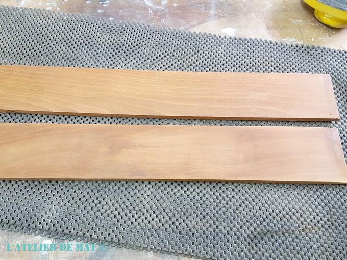 Premier essai et premier hic: l’une des deux planches n’est pas droite….Et ce n’est pas la mienne ;). J’avais enduit les trous laissés par les crochets d’origines car je comptais conserver les deux petits tasseaux existants, mais comme ils ne sont pas droits je vais devoir les enlever.
