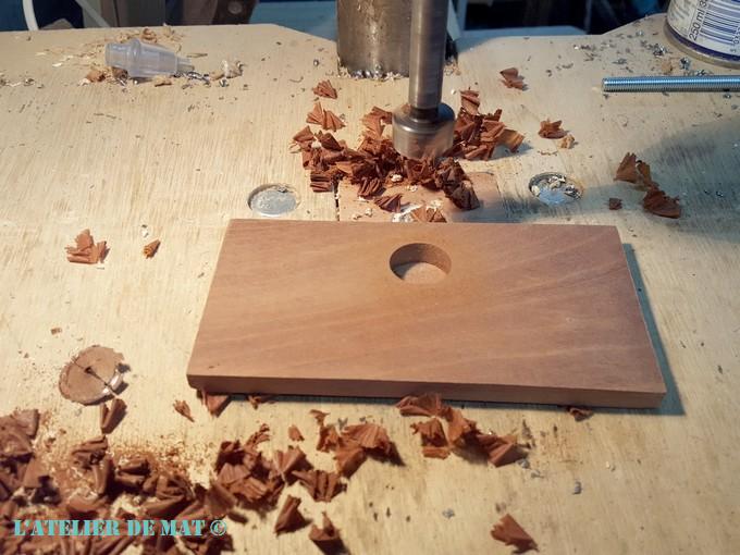 Comme l’ajout de poignées n’était pas envisageable à cause du manque de profondeur, j’ai usiné des trous dans les façades grâce à ma perceuse à colonne et à une mèche Fortsner.