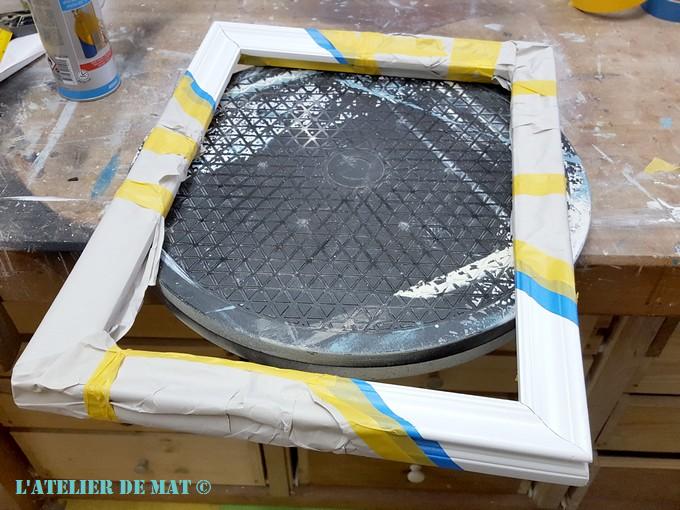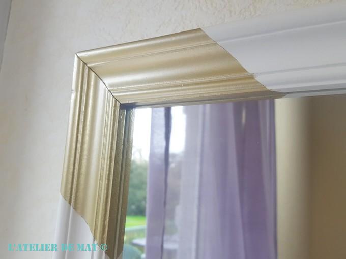 La pluie ayant cessé, j’ai pu peindre le cadre. Le blanc que j’avais choisi me convenait parfaitement, mais il manquait un petit truc, la petite touche « Wow » en somme ;). Alors vu que la bombe dorée était sortie, pourquoi ne pas tenter un petit truc avec. J’ai donc bien calfeutré le cadre pour ne laisser apparaître que deux angles.