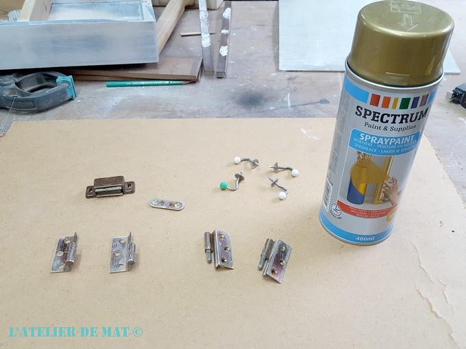 En attendant que la pluie cesse pour pouvoir peindre le cadre, j’ai pris le temps de relooker la quincaillerie. Il y a bien évidement les charnières, mais aussi l’aimant de la porte et quelques uns des crochets d’origine. Alors pour harmoniser le tout , ce projet m’est paru comme l’occasion idéale d’essayer ma bombe couleur « dorée ».