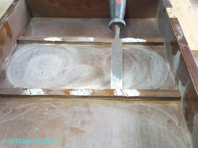 Ce n’est pas une opération compliquée, mais il faut être un minimum délicat. Si on y va en mode « c’est moi l’homme, je suis fort », bah on risque d’arracher le contreplaqué servant de fond. Alors pour s’éviter cette galère, on insère un ciseau à bois sous le taquet et par des petits mouvements on finit par le décoller. Dès qu’on arrive à le lever un peu on change le ciseau de place pour continuer.