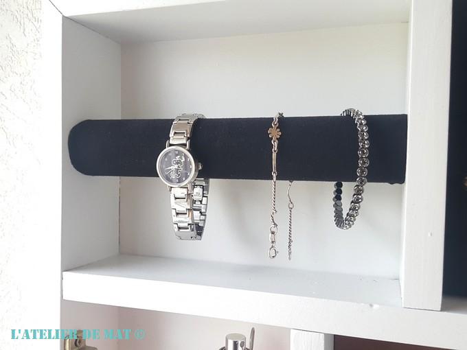 Le présentoir à montres/bracelets s’enlève en tirant vers soi. Il permet ainsi de ne pas avoir à ouvrir et fermer les bracelets pour les suspendre.