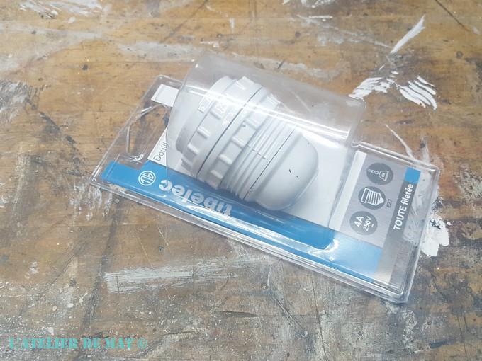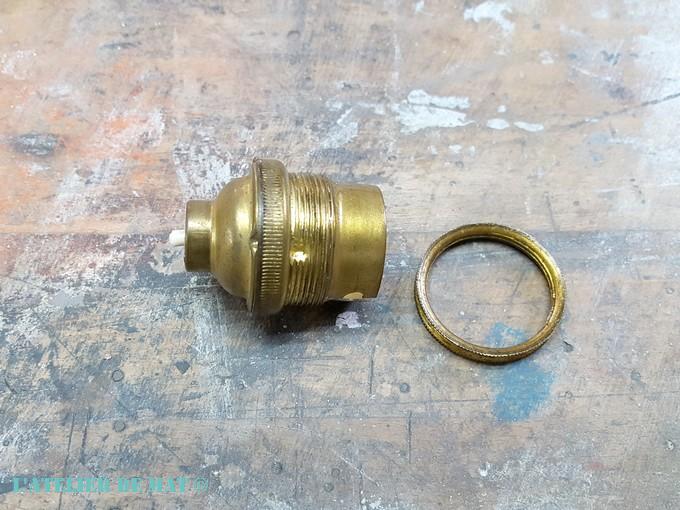 Avec l’abat jour finalisé, il ne me restait plus qu’à revoir la partie électrique. Au revoir l’ancienne douille à baïonnette en laiton. La couleur n’ira pas avec le reste de la lampe, la bague de fixation de l’abat jour ne permet pas d’assurer un bon maintien et les ampoules à baïonnette on n’en trouve pas partout surtout des récentes à LED. Autant de bonnes raisons donc de changer ce culot.