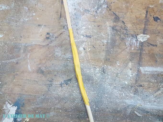 L’astuce pour passer une câble souple dans un pied de lampe est d’utiliser un guide rigide. Ici je me suis servi une chute de bois mais cela marche bien avec des baguettes chinoises par exemple. Il suffit juste d’associer le guide et le fil avec un peu de scotch à peinture.