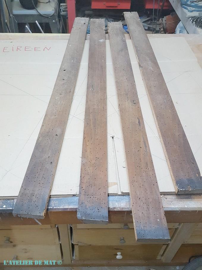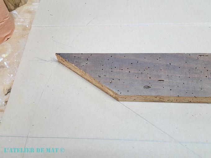 Le petit hic quand on travaille avec une planche qui a pris de la patine, c’est que les coupes se voient bien en général. Alors pour tenter d’attenuer un peu cela, j’ai dilué de la peinture dans de l’eau et j’en ai appliqué beaucoup sur les coupes et un peu les faces aussi.