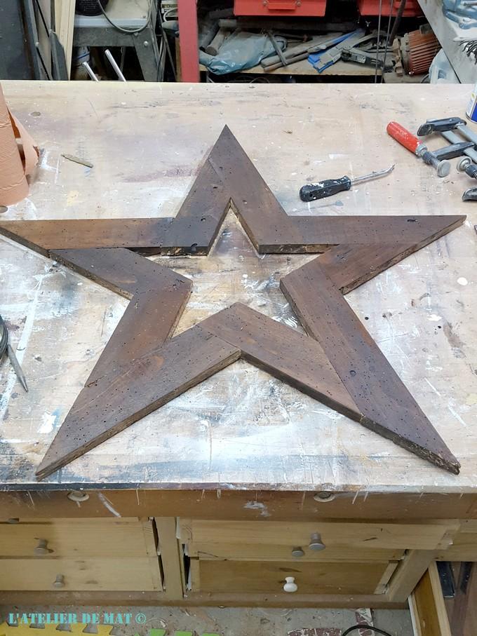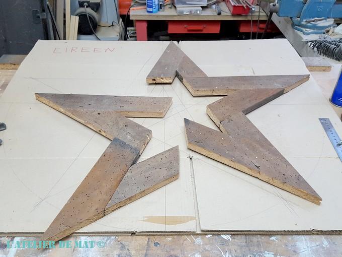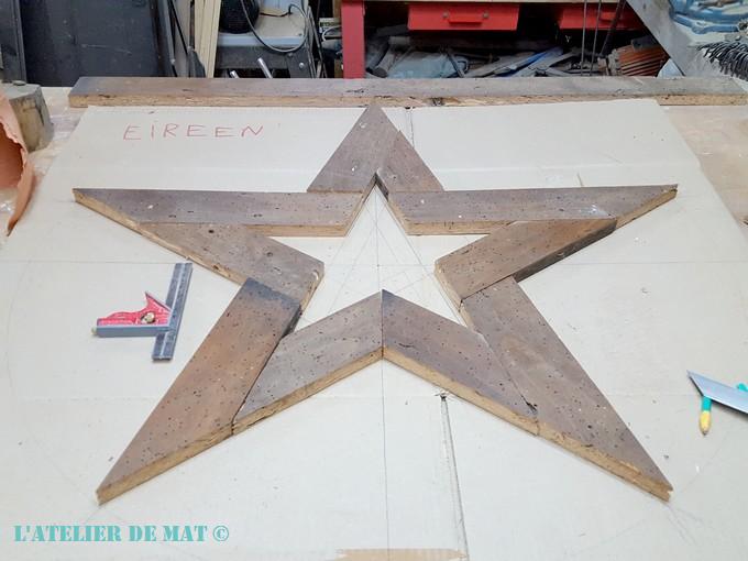 Après il m’a suffit de relier les points entre eux pour obtenir mon modèle d’étoile. Les traits intérieurs que l’on peut voir sur la photo sont dus à mes essais pour savoir quelle largeur de planche utiliser. J’en suis arrivé à la conclusion que des planches de 7 cm de large seraient ce qui donnerait le meilleur résultat.