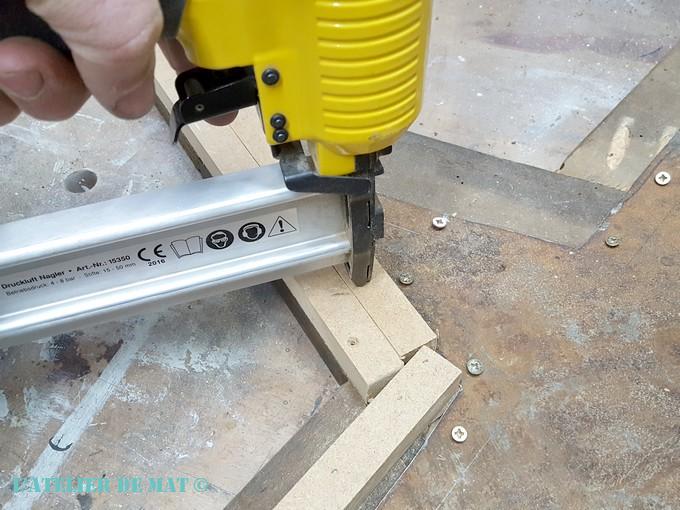 Je les ai fixés grâce à mon cloueur pneumatique qui est l’outil parfait pour ce genre de travail. La petite astuce pour s’assurer que tous les tasseaux seront cloués à la même distance du bord est d’utiliser un de ces tasseaux comme repère. Ici je l’ai aligné sur le bord et j’ai juste eu à clouer l’autre.