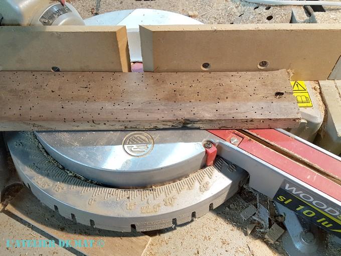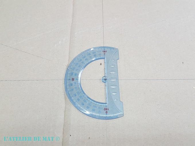 Grace au rapporteur, j’ai pu calculer sur mon carton l’angle auquel je devais effectuer ma première coupe : 54 degrés. Par chance ma scie à onglets peut aller jusqu’à 60 degrés ! Tout juste mais ça passe.;)