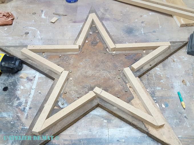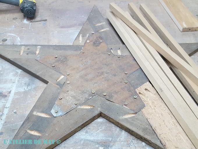 Il ne me restait donc plus qu’a fixer l’étoile en tôle au reste à l’aide de quelques vis. Je dis « quelques » mais je n’ai pas hésité à en mettre afin que la tôle et le bois jointent correctement. Dans des chutes de MDF, j’ai débité des petits tasseaux qui allaient me servir à créer un peu de volume au dos de l’étoile et me donner un support pour l’éclairage.