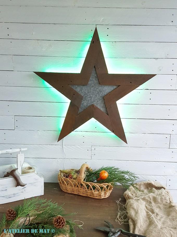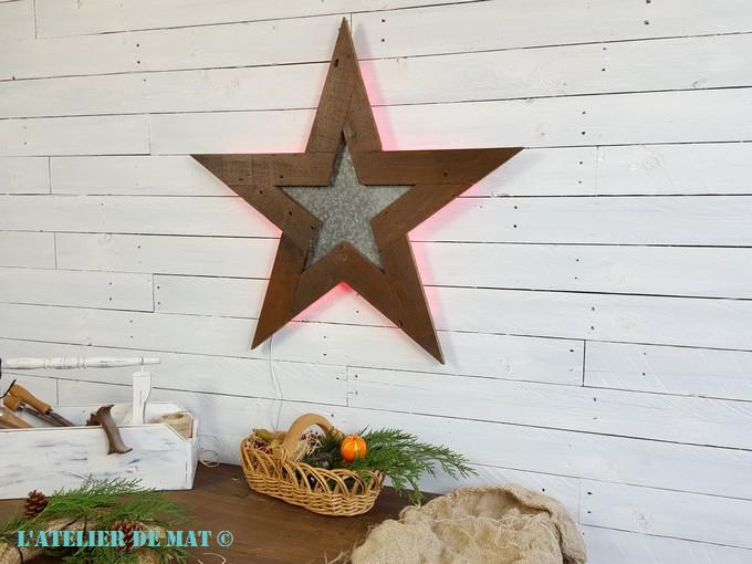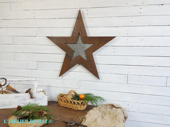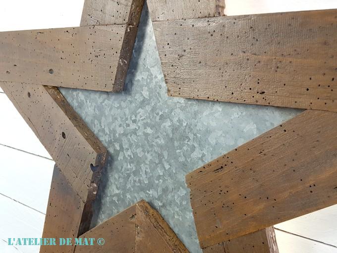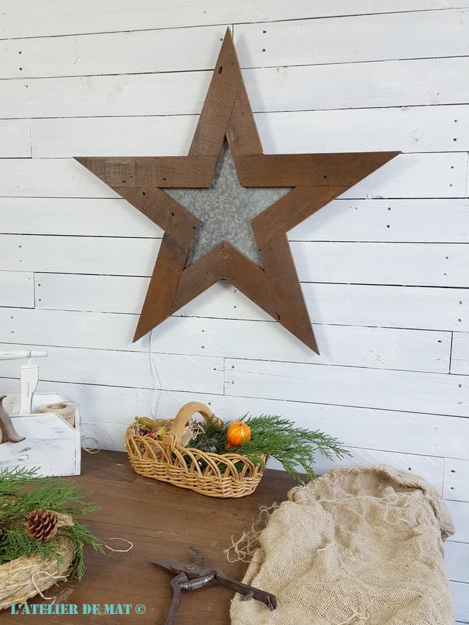 Et voilà le résultat final une fois l’étoile accrochée au mur. L’association de la tôle en galva avec ce vieux bois apporte bien cet effet « Farmhouse », ou campagnard comme on dirait chez nous, que je recherchais.