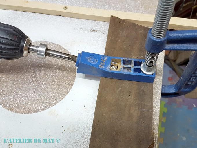 Toutes les pièces étant désormais coupées, il me restait à fixer le tout ensemble. J’ai donc sorti mon kit mini Kreg qui est mon outil passe partout quand j’ai besoin de réaliser des fixations peu communes. On fixe le petit gabarit et on perce.