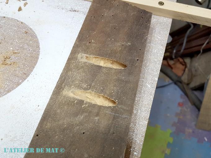 Cela donne un trou légèrement incliné. Pour maximiser la fixation j’ai décidé de faire deux trous par morceau à fixer.