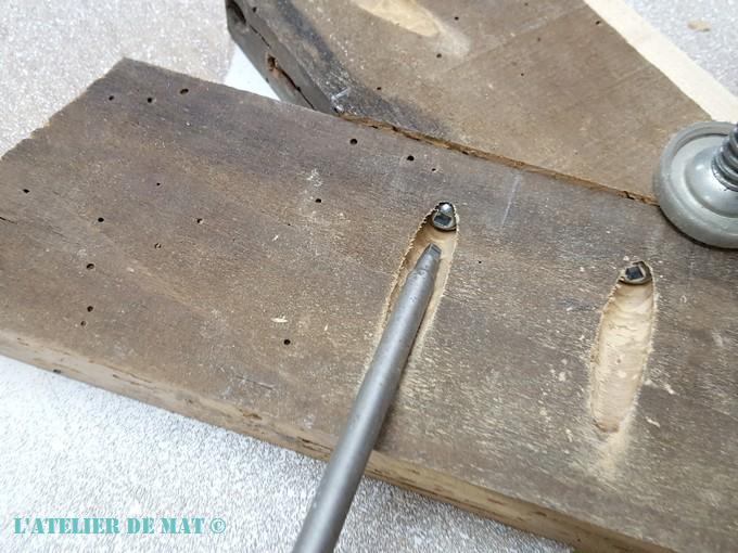 Il suffit juste ensuite d’utiliser les vis spéciales et grâce à cet embout c’est un véritable jeu d’enfant. La seule précaution à prendre est de s’assurer que les faces des deux parties à fixer ensemble sont au même niveau. Ici on peut voir qu’une planche est plus épaisse que l’autre et donc qu’elle dépasse légèrement. C’est une bonne chose car les faces visibles seront donc alignées.;).