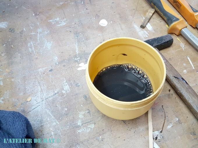 A ce stade là, cela ne ressemble pas encore à grand chose mais j’étais sur la bonne voie selon mes plans ;). J’ai nettoyé la tôle galva et j’ai utilisé une petite astuce pour lui donner du brillant: j’ai appliqué du WD40 sur la surface et j’ai frotté avec un vieux chiffon. Cela fait briller la tôle et pour info cela marche aussi très bien sur le plastique si vous voulez un jour rénover un objet dans cette matière.