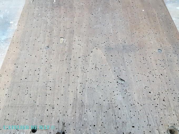Tous ces défauts laissés par les insectes au fil du temps donnent une patine inégalable. C’est notamment pour cette raison que je ne rechigne jamais à récupérer de vieilles planches même abîmées. Il faut juste trouver le bon projet pour les utiliser ;).